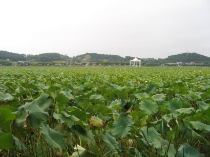 저수지가 전부 연꽃으로 빼곡하다. 드문드문 연꽃이 피었다. 여름에 축제때도 한꺼번에 활짝 피지는 않는다 한다.