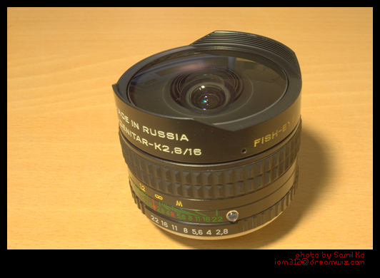 장터에 깨끗한 MX가 올라오지 않았나 들어갔다가 발견한 렌즈다. 러시아제 수동렌즈로, 옆구리에 적힌 FISH-EYE 라는 글자, 바로 어안렌즈다. 16mm 답게 필카에 마운트 해 보니 엄청난 외곡의 초광각 세상을 보여준다. 퇴근길 집 아래 중앙대 부속 병원앞에서 흑석동 사는 귀여운 아가씨한테 15만냥 주고 분양받았다. 엉뚱하게 이걸 사는 바람에 a28mm 하고 DA18-55mm 번들이는 팔려나갈 운명에 처했다. 디카에서 번들이만큼 저렴한 18mm 광각렌즈는 없기 때문에 그냥 가지고 있었는데 번들이는 단렌즈 영입후로 거의 사용치 않던 참이고, 더구나 주로 사용하는 사진기가 디카에서 필카로 바뀐 후로는 정말 쓸일이 없어져서(번들이의 18-28mm 영역은 필카에서 비네팅이 발생한다) 어차피 방출될 운명이었다. a28mm 도 필카 살때 딸려온 싸구려 정체불명 28mm 렌즈로 어떻게든 대체할수 있기 때문에 어안렌즈 사면서 들어간 돈을 메꾸기 위해 팔 작정이다. 이가 없으면 잇몸이다. 없으면 없는대로! 이제껏 나를 버티게 만든 나의 생활신조다. 두 녀석을 팔면 18만원 정도 받을수 있으니, 어안렌즈 사느라 들어간 돈 15만원에서 3만원이 남는군. 그 3만원은 낼 여행비로 쓰면 되겠다.