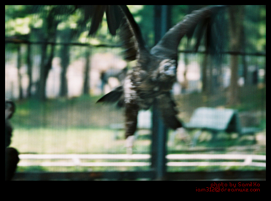 하지만 운이 없기도 했다. 이 넘이 날아오르는 멋진 순간을 잡았으나…. 셧터 속도를 확보하지 못해서 이리 망쳐부렀다. 독수리 사육장이 해를 등지고 있어서 그늘이 짙게졌다. 아까비…