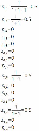 즉, 문서 1,2 는 유사도가 1이고 1,3 2,3 은 유사도가 0이다. 유사도 계산값이 0보다 큰 것만 골라 내면 될 것이다. 그러면 1, 2 두개의 문서가 묶인 부류 하나와 3 혼자 있는 부류 하나 해서 두개의 부류를 얻게 된다.