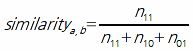 여기서 n11은 문서 a, b 모두 1인 비트 수, n10은 문서 a 만 1인 비트 수, n01은 문서 b 만 1인 비트 수 이다.