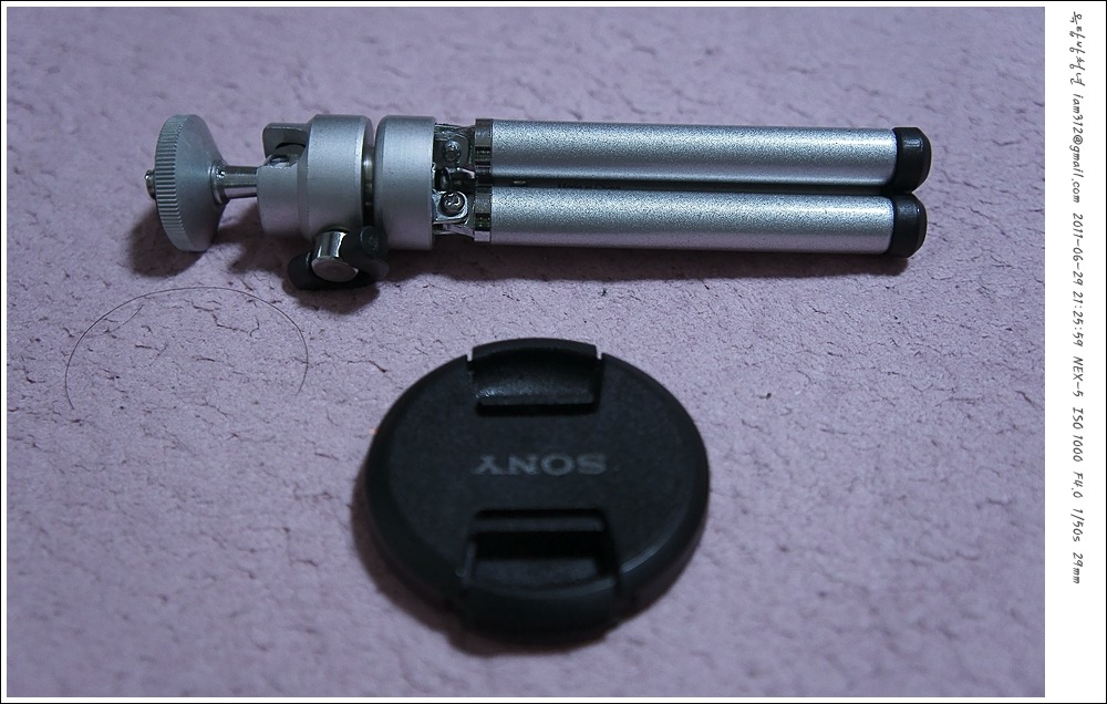 엄청 작다. 이거 주머니에도 들어가겠다. 크기 짐작이 쉽도록 NEX-5 번들렌즈 캡을 놨다. 참고로 렌즈 캡은 49mm 이다.
