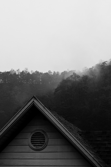 아침에 숙소 앞 홍천강의 물안개를 기대 했으나, 비가 와서 산위에 안개만 끼었다.