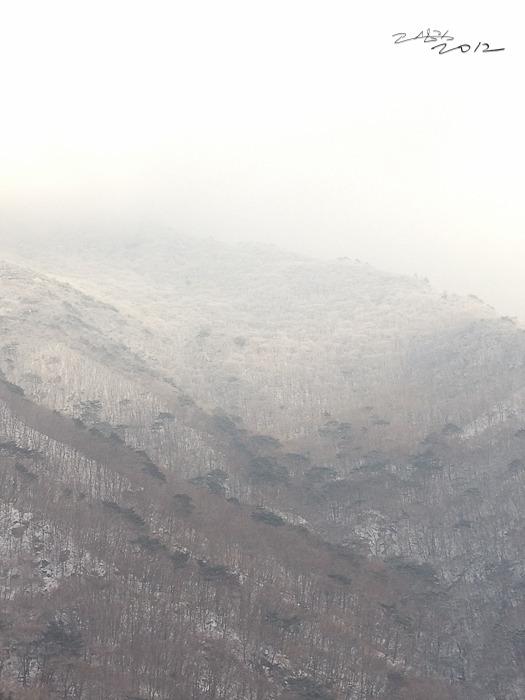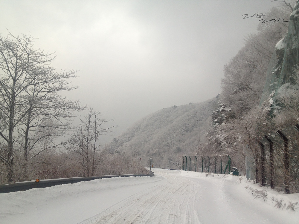 그 날 산 아래는 날이 풀려서 눈은 다 녹은지라, 승용차들은 체인을 장착하지 않고 돌아다니다가 진입로에서 통제되어 차를 돌려 돌아갔다.