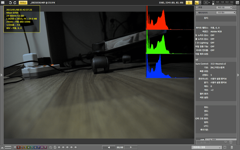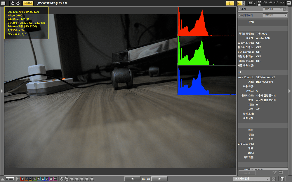 정말 다르다. nef의 raw 저장 옵션에서 무손실 압축과 압축안함으로 각각 찍어 viewNX에서 읽은 화면을 캡처한 것이다. 아래쪽 압축 안함 옵션으로 찍은 이미지가 살짝 더 어둡고 화이트밸런스도 약간 누르스름하다. 여러장을 찍어 봤는데 공통적인 점은 무손실압축을 한 버전이 압축 안함 버전보다 밝고 화이트 밸런스가 마젠타끼가 조금 있는 것이다. 느낌상, JPG류의 데이터 손실이라기 보다는 암부를 좀 더 밝게 계조를 노멀라이즈하고 화이트 밸런스를 살짝 조정을 하여 보다 보기 좋은 이미지로 리터칭한 느낌이다.