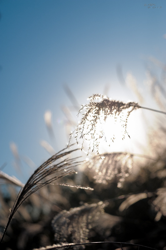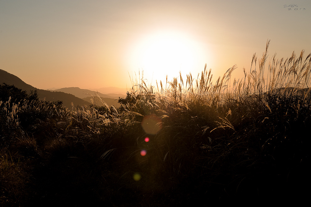 해가 뜨고 햇빛을 받아 빛나는 억새들.