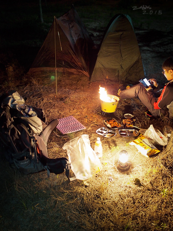 우진형에게 뜬금없이 금요일 오후에 전화가 왔다. 최종 면접 통과 했다고 바람쐬러 야영 가자고 한다. 두어번 같이 간 야영이 제법 괜찮았나 보다. 아내에게 안면도 잠깐 다녀오겠다 얘기 하고, 집에 들러서 배낭을 챙겨서 금요일 밤에 바람아래 해수욕장으로 떠났다. 지난번에 갔더니 모기가 엄청 많았기에 이번에는 화로양동이를 가져가서 모닥불을 피웠다.