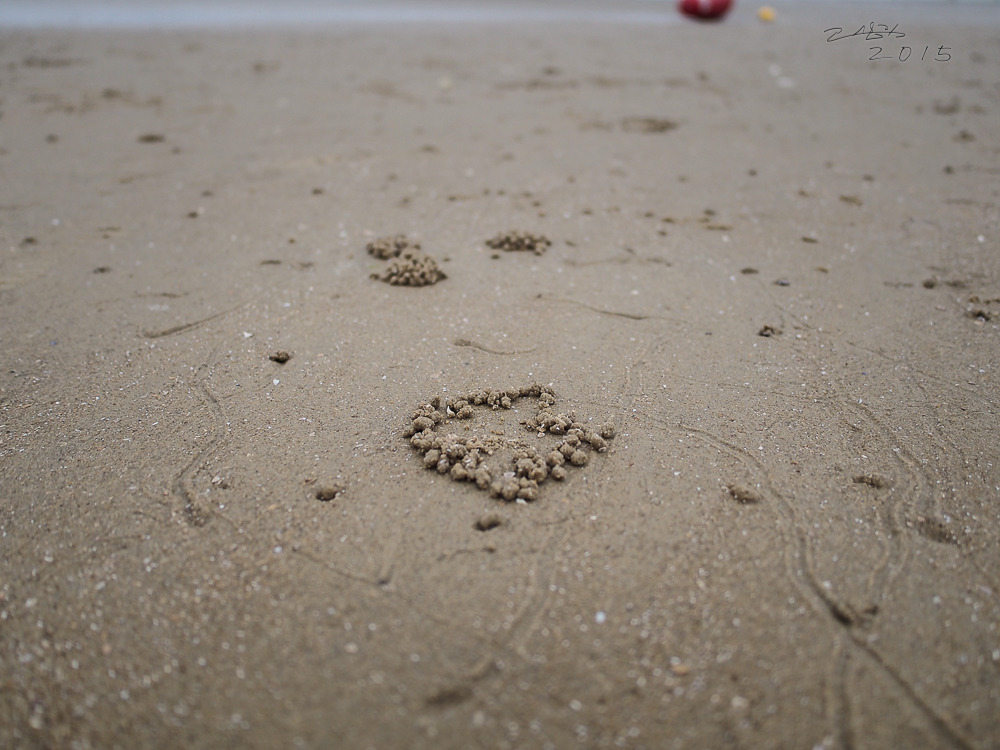 게가 모래알갱이를 하트처럼 만들다 말았다.