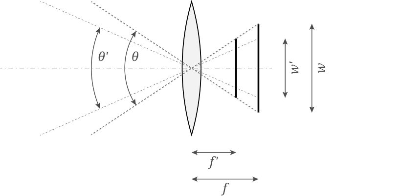 센서 사이즈가 작아질 경우, 화각을 동일하게 하기 위해서(화각 세타)는 초점거리가 그 만큼 작아져야 한다. 여기서는 f’이 마포, f는 FF 로 보면 되겠다.